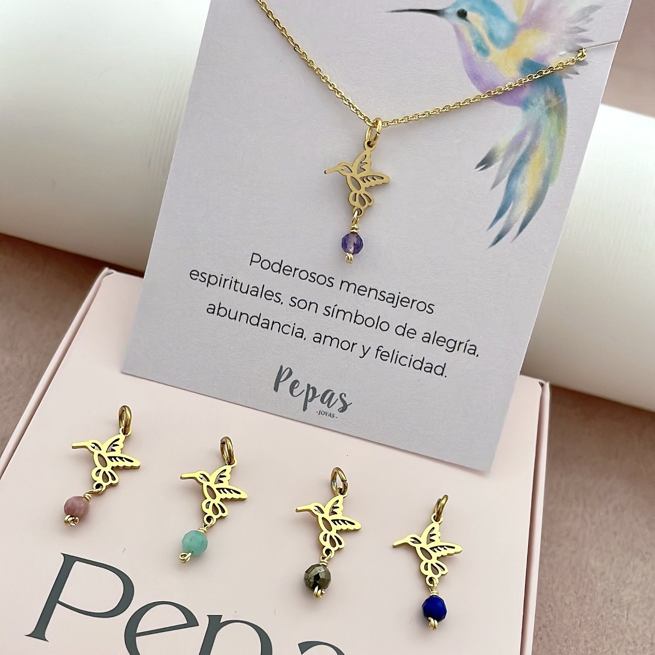 Dije: Colibrí de acero inoxidable con Piedra Natural – Rodocrosita, Amatista, Amazonita, Lapislázuli o Pirita