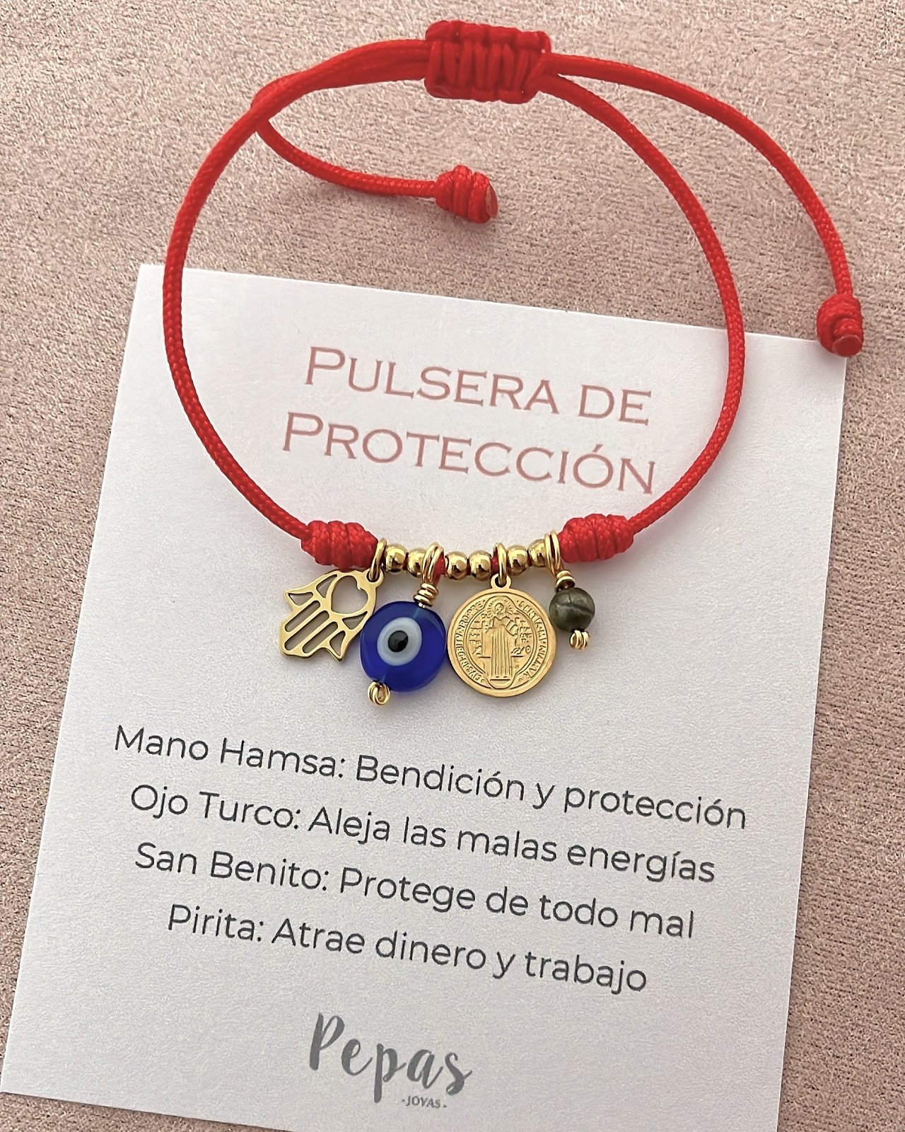 Pulsera de Hilo con Dije de San Benito, Mano Hamsa y Ojo Turco