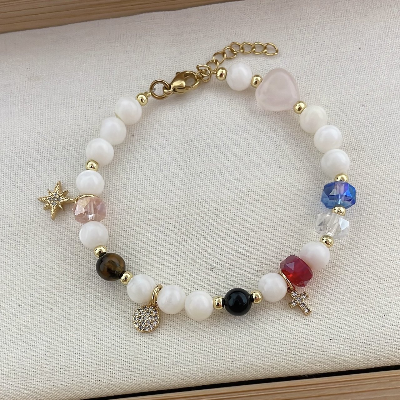 Material: Piedras Naturales (Ónix, Ojo de Tigre, Cuarzo Rosado), Nácar, Muranos e Hilo Hindú